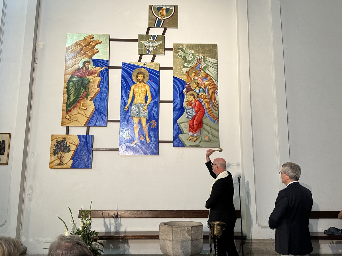 El bisbe de Girona, fra Octavi Vilà, ha beneït el nou conjunt iconogràfic situat a l’absis de l’església. L’obra està inspirada en l’estil bizantí, amb colors molt vius, i l’han realitzat els artistes calellencs Empar Morató i Guillem Torné.