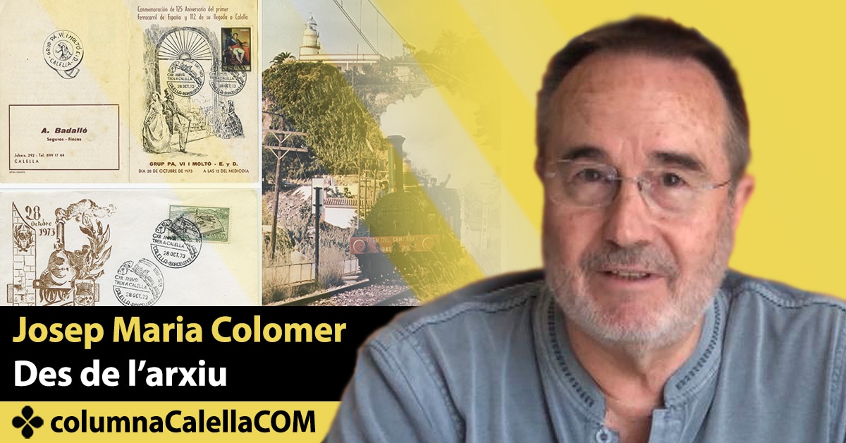 Del seu arxiu, he manllevat les dades i imatges del programa d’aquella activitat… Fou el mes d’octubre de l’any 1973 i celebraven el 125è aniversari del primer ferrocarril d’Espanya i el 112è aniversari de l’arribada del tren a Calella… Els actes commemoratius tingueren lloc el dia 28 d’octubre, amb una concentració d’autoritats locals i de la Renfe a l’estació… El programa esmenta també l’arribada de la Banda de Cornetes i Tambors de la Creu Roja Local i Majorettes de Canet… Inauguració i benedicció del Monument situat als jardins de l’estació Renfe; inauguració de l’Oficina Provisional de Correus i mata-segells especial de la commemoració; presentació i lliurament de la medalla commemorativa i per acabar un vi d’honor a la cafeteria de l’estació i comiat de les autoritats i convidats… Tot seguit a la Plaça de Catalunya, audició de sardanes per la Cobla Costa Daurada, organitzada i patrocinada per l’Agrupació Sardanista de Calella…