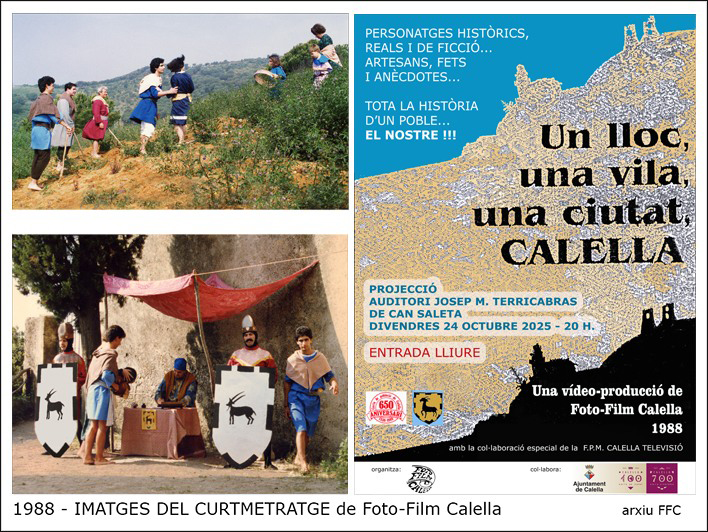 Aquell any, Calella celebrava el 650è aniversari de la concessió de la Carta de Població i el permís per establir un mercat al lloc anomenat “la calella” (cala petita) del veïnat de Capaspre… Amb aquest motiu, Foto-Film Calella va realitzar el curtmetratge – documental “Un lloc, una vila, una ciutat… Calella” que, amb guió adaptat per la Jacinta Tresserras (epr) d’un text literari de l’historiador Josep Maria Pons i Guri, explica a través d’una mateixa parella de protagonistes, els esdeveniments que al llarg dels anys van anar transformant el “lloc” anomenat “la calella”, fins arribar a la “Calella Ciutat” dels anys de la gravació (1988)…