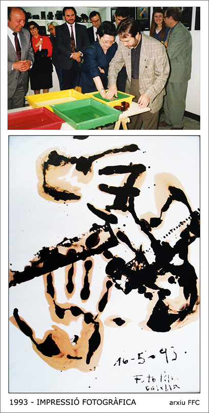 El dia de la inauguració del local de FFC, mitjançant tècniques fotogràfiques (cubetes, revelador, llum, fixador, etc…) vam elaborar una mena d’impressió química/fotogràfica per recordar aquella data… Suca-mulla en un bany de revelador de les mans de l’alcalde (Joaquim Rey); del llavors president de FFC (Quim Botey); de la Delegada de la Generalitat (Gemma D’Armengol) i un retall de negatiu de 35mm… Tot seguit, impressionar mans i pel·lícula damunt un paper fotogràfic, després llum, bany d’atur i fixador… Tota aquesta parafernàlia per deixar l’empremta “oficial” de la data de inauguració d’aquell local social i que segueix formant part de la decoració de l’actual…