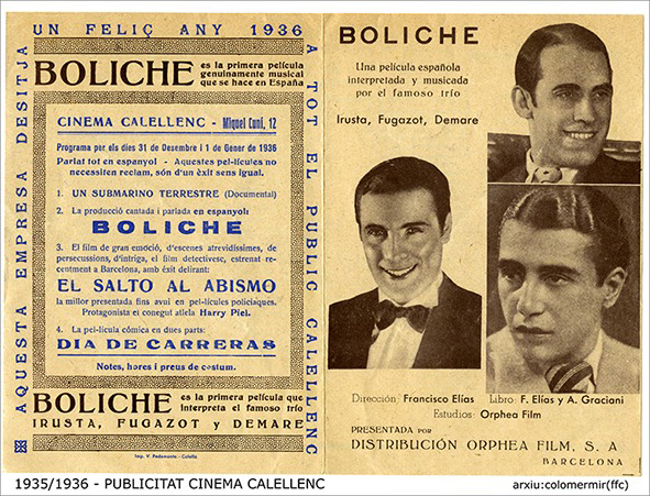 Fent una repassada als històrics cinemes de Calella, hi trobem l’anomenat Cinema Calellenc, ubicat al carrer Miquel Cuní … La publicitat d’aquest programa, desitjant un Feliç Any 1936 (premonició equivocada), ens informa dels films que s’hi projectaven… “Boliche” era la pel·lícula estrella “primera película genuinamente musical que se hace en España… Interpretada y musicada por el famoso trio Irusta, Fugazot i Demare… dirección Francisco Elias”…