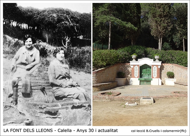 A les fotografies hi veiem les germanes Riera, de Cal Moliner dels Bous (imatge recuperada de la col·lecció de Baltasar Cruells) descansant en aquesta antiga font de la finca de Can Pelayo (anys 30), mentre a l’altre fotografia, del mateix indret; hi tenim l’actual Font dels Lleons, la que coneixem avui dia… Tot plegat una mica d’història local…