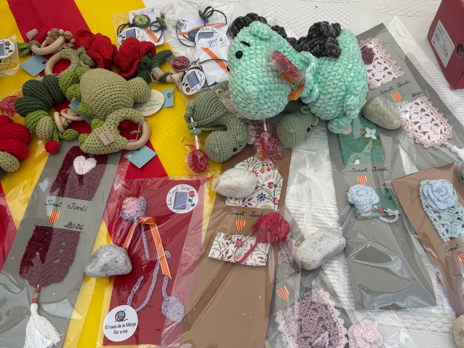 Més enllà dels llibres, la Diada també és i ha estat sinònim de roses. A la parada de l’associació d’artesans, Margarita Manzano destacava l’èxit de les seves creacions: “Les roses són de ganxet, sí. Aquí tot és artesanal, tot està fet a mà i per nosaltres”, explicava des de la seva parada on també s’hi podien trobar dracs, punts de llibre i altres detalls vinculats a la diada.